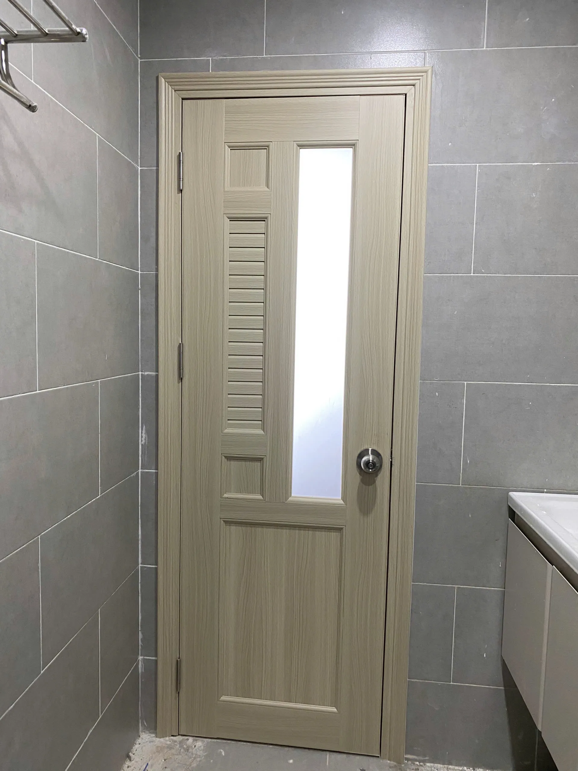 Cánh cửa: Được ghép từ các thanh nhựa PVC dày khoảng 35mm, bên ngoài phủ lớp da giả gỗ chống thấm nước, có thể kết hợp với kính hoa văn hoặc tấm nhựa mỏng để tăng tính thẩm mỹ và sự thông thoáng.
